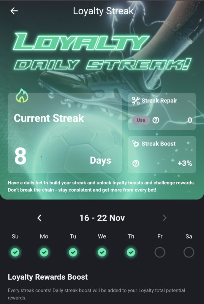 A streak reward system is a gamification mechanic where users receive incentives for repeating an action daily. In betting, that could mean: